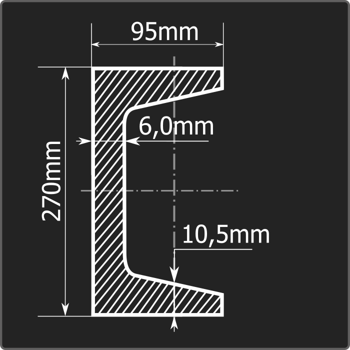 Швеллер стальной горячекатаный с уклоном внутренних граней полок  27У и длиной 12м. Материал - углеродистая сталь. Соответствует требованиям ГОСТ 27772-2021.