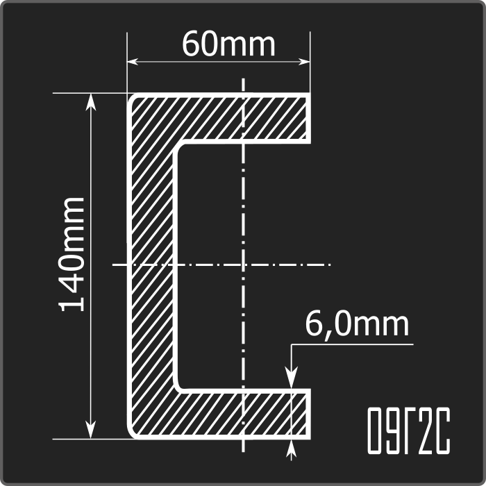 Швеллер стальной холоднокатаный гнутый равнополочный 140*60мм, толщиной 6,0мм и длиной 12м. Материал - низколегированная сталь. Соответствует требованиям ГОСТ 19281-2014.