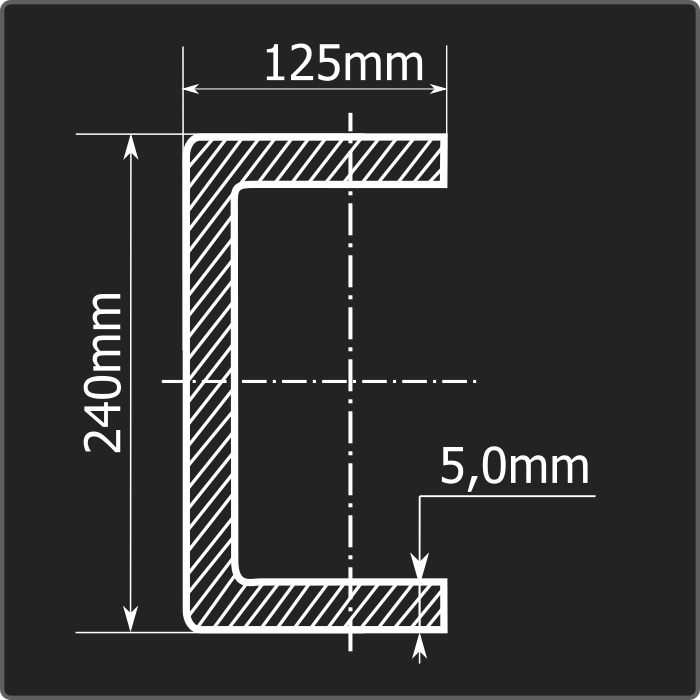 Швеллер стальной холоднокатаный гнутый равнополочный 240*125мм, толщиной 5,0мм и длиной 12м. Материал - углеродистая сталь. Соответствует требованиям ГОСТ 8278-83.
