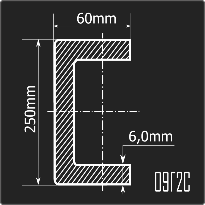 Швеллер стальной холоднокатаный гнутый равнополочный 250*60мм, толщиной 6,0мм и длиной 12м. Материал - низколегированная сталь. Соответствует требованиям ГОСТ 19281-2014.