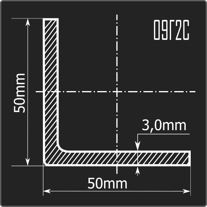 Угол стальной холоднокатаный гнутый равнополочный 50*50мм, толщиной 3,0мм и длиной 12м. Материал - низколегированная сталь. Соответствует требованиям ГОСТ 19281-2014.