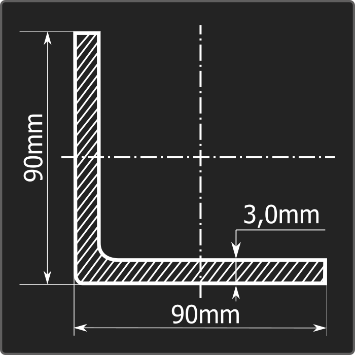 Угол стальной холоднокатаный гнутый равнополочный 90*90мм, толщиной 3,0мм и длиной 6м. Материал - углеродистая сталь. Соответствует требованиям ГОСТ 19771-93.