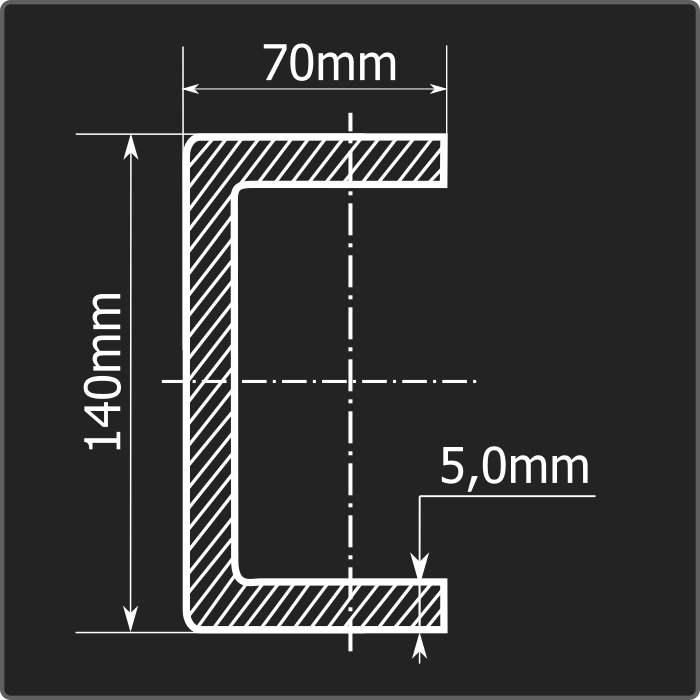 Швеллер стальной холоднокатаный гнутый равнополочный 140*70мм, толщиной 5,0мм и длиной 12м. Материал - углеродистая сталь. Соответствует требованиям ГОСТ 8278-83.