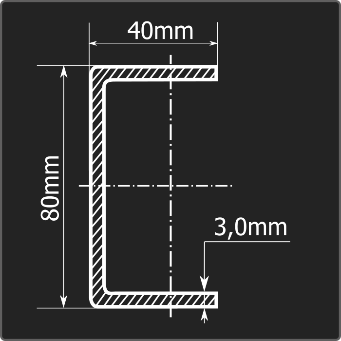 Швеллер стальной холоднокатаный гнутый равнополочный 80*40мм, толщиной 3,0мм и длиной 12м. Материал - углеродистая сталь. Соответствует требованиям ГОСТ 8278-83.