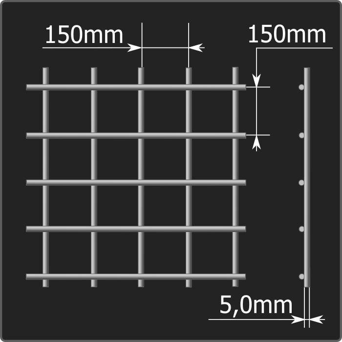 Сетка сварная с размером стороны ячейки 150*150мм из термический необработанной проволоки диаметром 5,0мм шириной карты 2,0м и длиной 3,0м. Соответствует требованиям ТУ 25.93.13-001-03876796-2019.