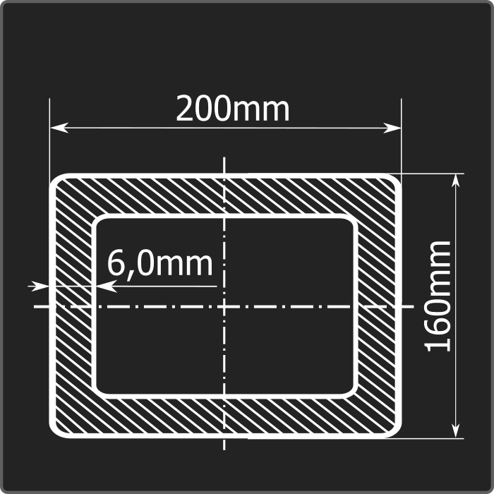Труба профильная стальная прямоугольного сечения 200*160мм, длиной 12м и толщиной 6,0мм. Материал - углеродистая сталь. Соответствует требованиям ГОСТ 30245-2003. Стандартный пакет: вес - 3,462тн., количество - 9шт.